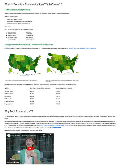 During the user tests, we observed that upon receiving the prompt, users’ first reaction to opening techcomm.unt.edu was to ask what technical communication is. The web content at the time was written for an audience already familiar with technical communication, inhibiting unfamiliar readers from connecting with the content. The web page “Why Tech Comm?” was intended to educate users on the value of a tech comm degree. However, it neglected to define the profession and instead capitalized on employment outlook statistics. Students in our user tests expressed it would be difficult to decide whether they wanted to pursue a degree in technical communication if they didn’t know what technical communication was.